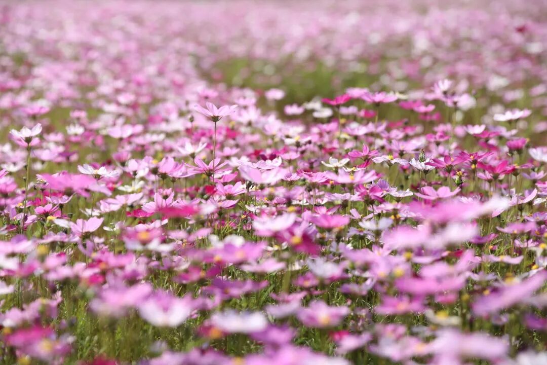 粉色的格桑花、紫色的紫花风铃木、 雪白的油茶花、焦糖色的落羽杉…… 每一幕都像从画里走出来。 找个周末,走一趟吧! 让我们奔跑在油画一般的景致中~ 格桑花海 走进冠旭数字时尚电子产业园, 仿佛踏入了一个五彩斑斓的童话世界。 这里不仅是工业厂区, 也成为附近市民的打卡地。 大片格桑花 在暖阳下肆意绽放, 粉的、白的、玫红的, 各色格桑花如繁星点点, 汇成了一片绝美花海。