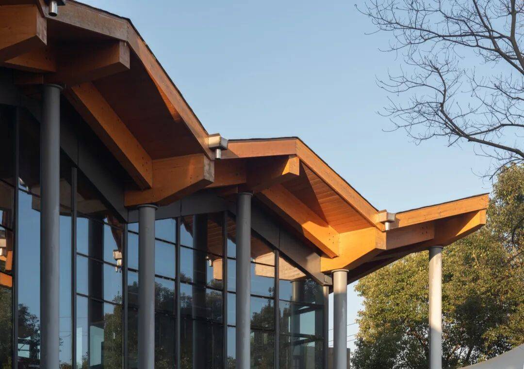 ▲屋顶细部 © 赵奕龙 从屋面内侧可见,木梁与木檩条构成均匀的结构逻辑,木质板面作为顶棚连续展开。深檐口将屋面厚度与结构层次直接暴露出来。由于弧形向心的平面控制,屋架在不同位置的尺寸与角度产生细微变化,檐口线因此呈现出更为丰富的起伏与转向。