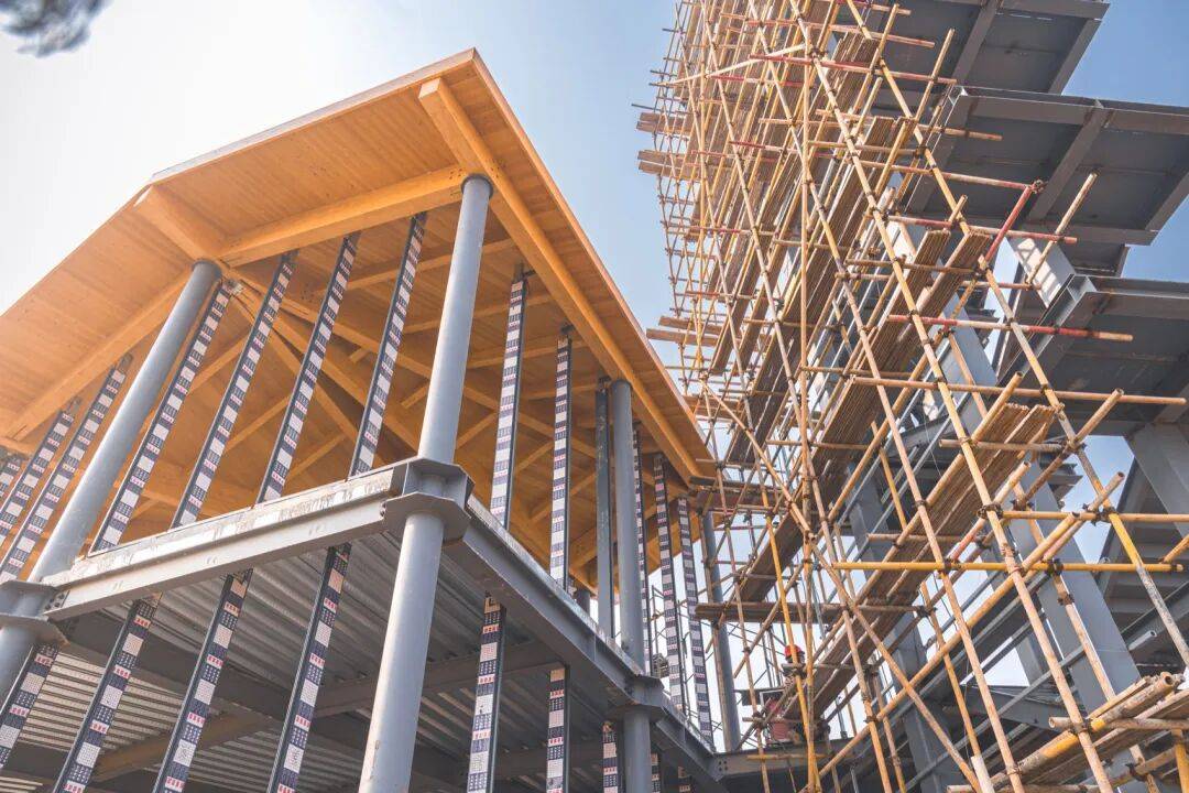 ▲项目鸟瞰(屋顶与田野) © 赵奕龙 在施工阶段,建筑的结构逻辑被最大程度地“裸露”出来:钢柱与钢梁先建立起清晰的受力网格,场地上出现一个通透的架空框架。随后,装配式木屋架逐榀吊装、定位,木梁与木板面向外延。钢结构楼梯作为垂直路径同步成形,使建筑在尚未完成围合时就已经呈现出清晰的空间骨架。