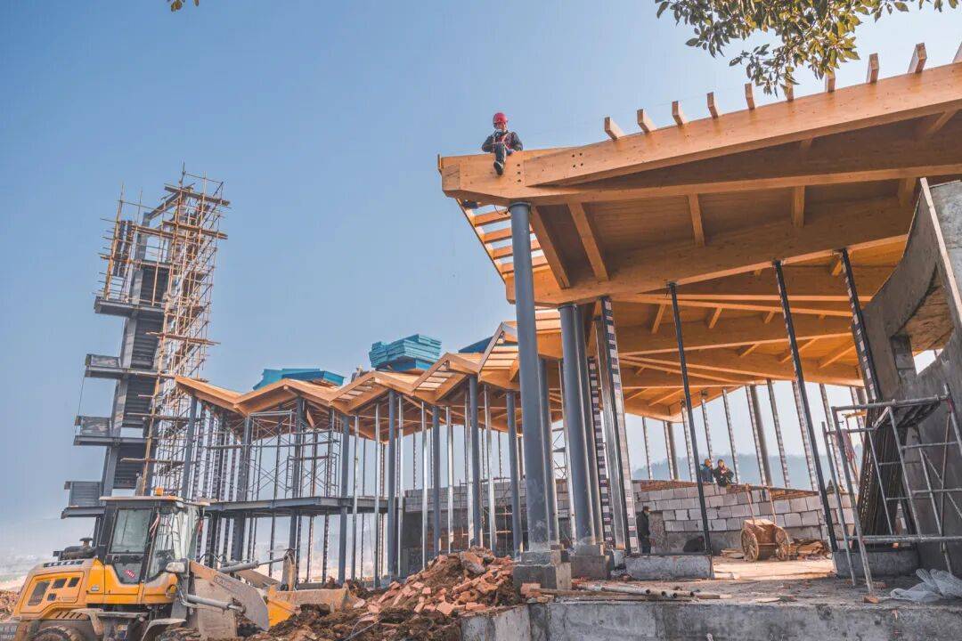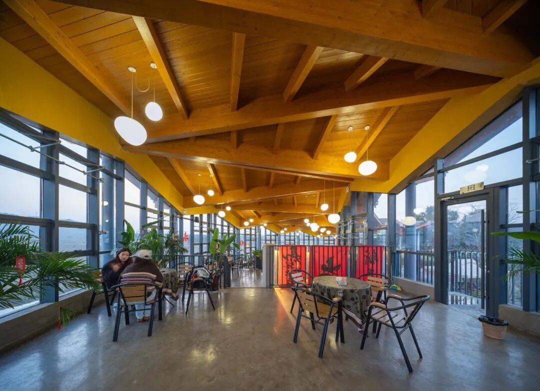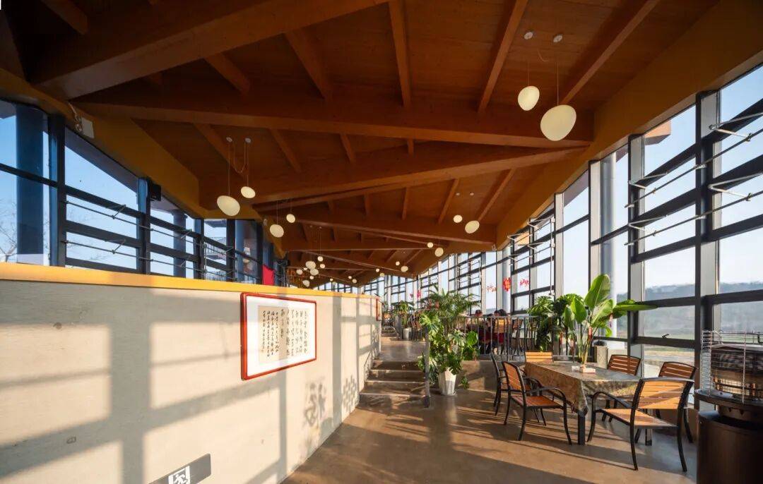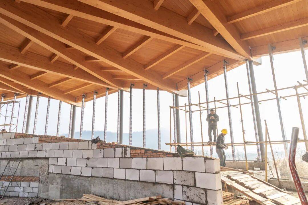 ▲施工过程 © 竺辉奇 室内以木梁与木质顶面形成连续、温暖的顶棚基调,折线屋面的节奏转译为起伏的梁架序列;弧形实体墙一侧承载展陈与信息界面,另一侧由大面积玻璃打开视线,田野与水面被引入日常的停坐与漫游。水平分格的窗带过滤光线,光影在混凝土地面与木构上移动,使空间在不同时间呈现出层次与方向感。