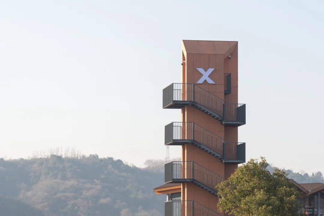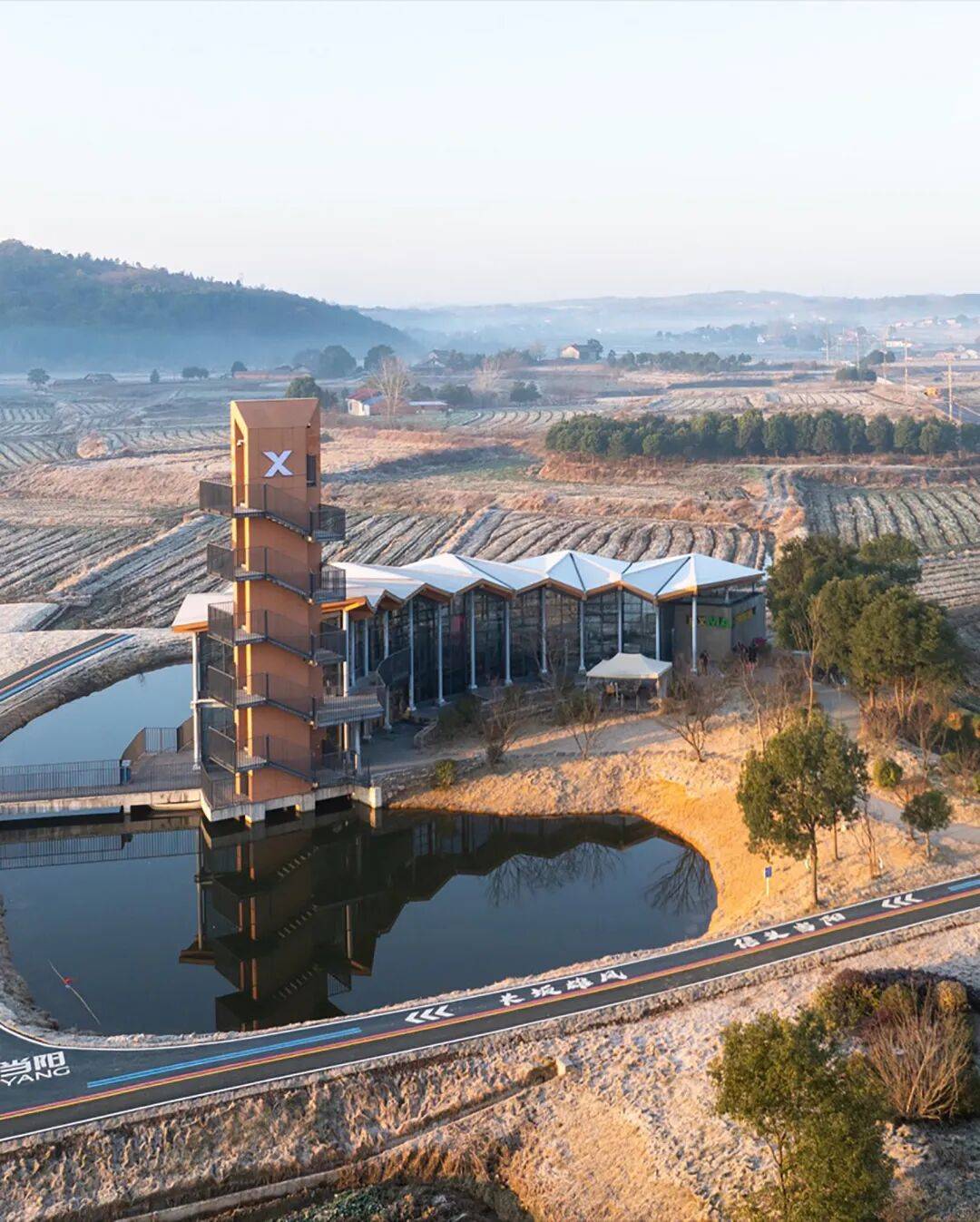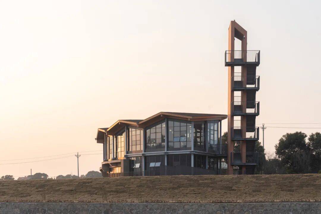 ▲周边道路视角 © 赵奕龙 材料与构造进一步强化这种“轻与重”的对比:建筑以混凝土框架作为稳定的基底,上部以钢结构与大面积落地玻璃幕墙组织公共界面,使展陈、咖啡与休憩空间与田水景观保持最大程度的渗透;局部插入实体片墙,提供展陈背景与必要遮蔽。塔楼的外置梯段以扁铁栏杆与平台串联,穿插包绕在外挂水泥装饰板的实墙之间,虚实结合使“地标”不以压迫的体量出现,而以可触摸的细部与光影建立亲近。