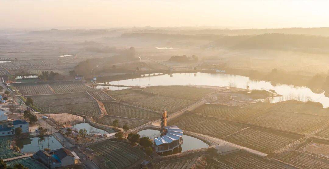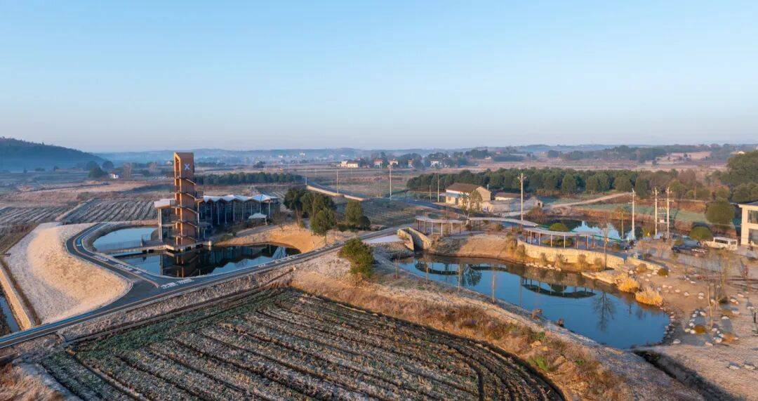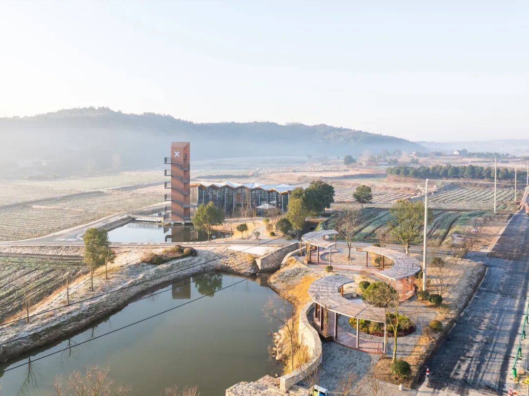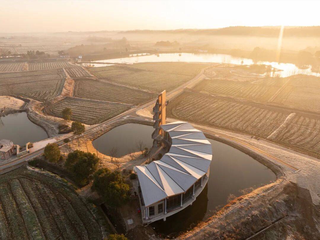 © 赵奕龙 稻田与水塘之间,一段不规则的用地被田埂与农路切割,一侧探入水面。项目同时承担稻作文化展示、农产品展销与游客停留的公共功能,并需要一处能够抬升视线的观景点。紧凑的尺度促成“塔与体的共生”:体验馆沿水岸展开,塔楼嵌入其端部,形成一组可被行走与观看的乡野装置。