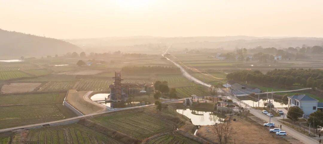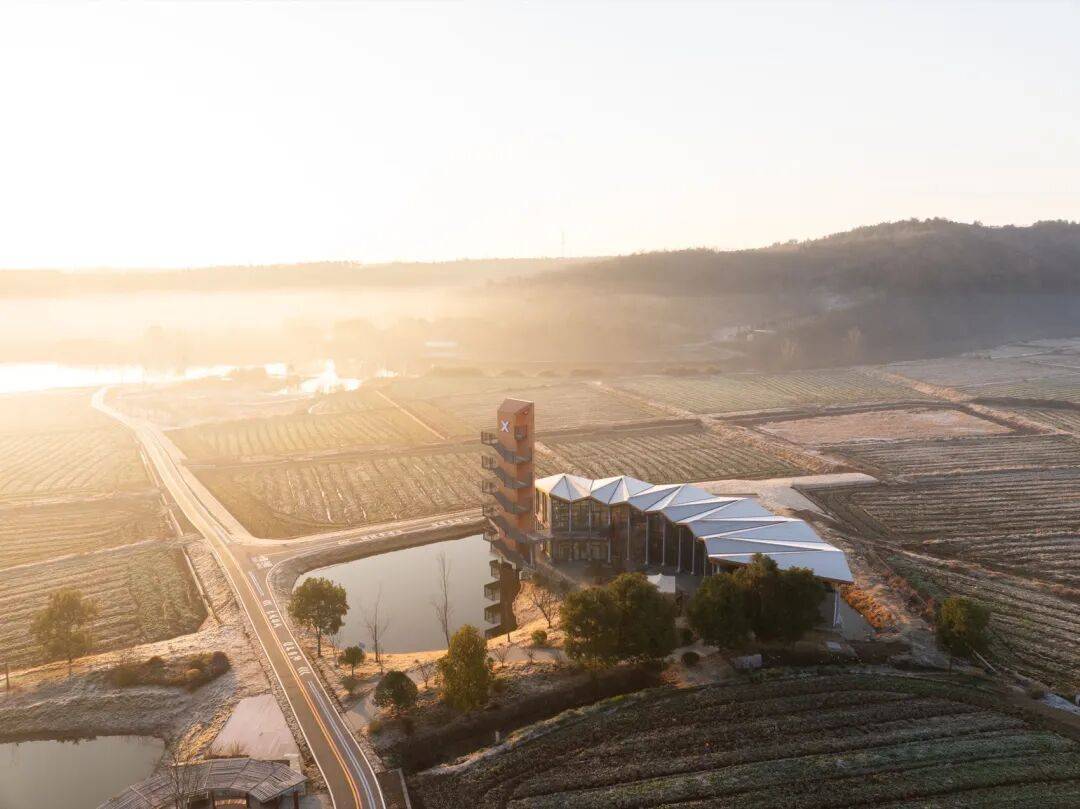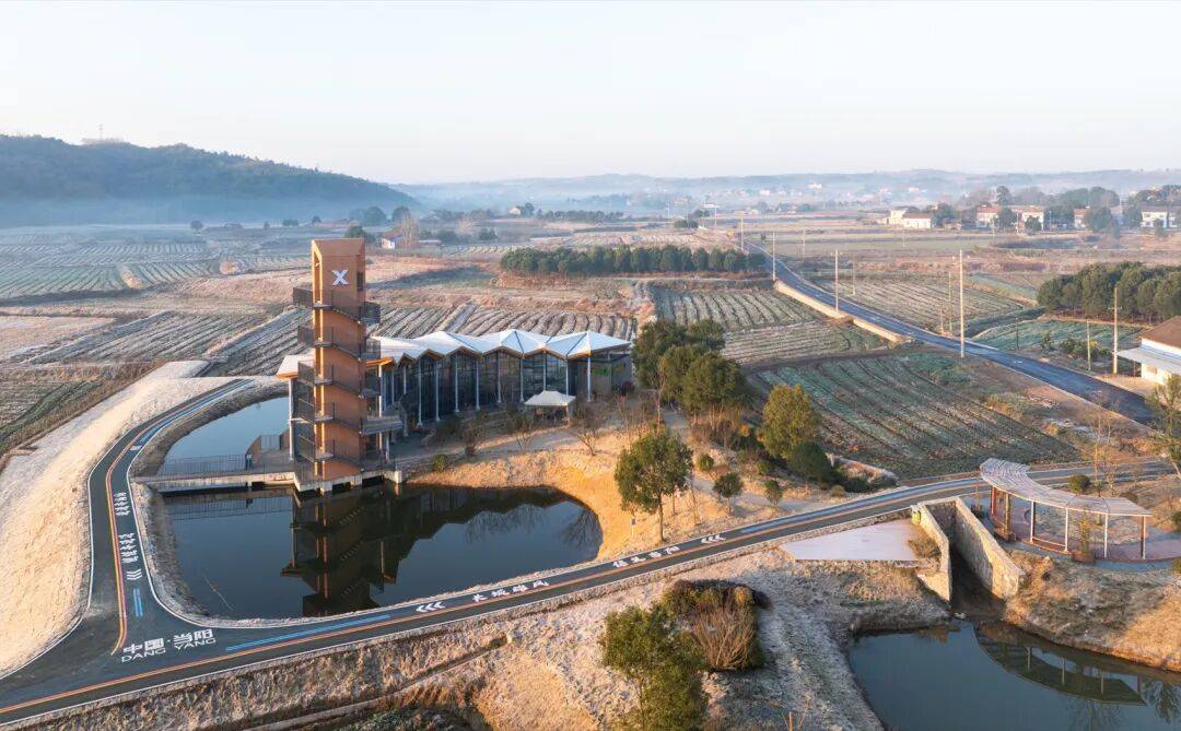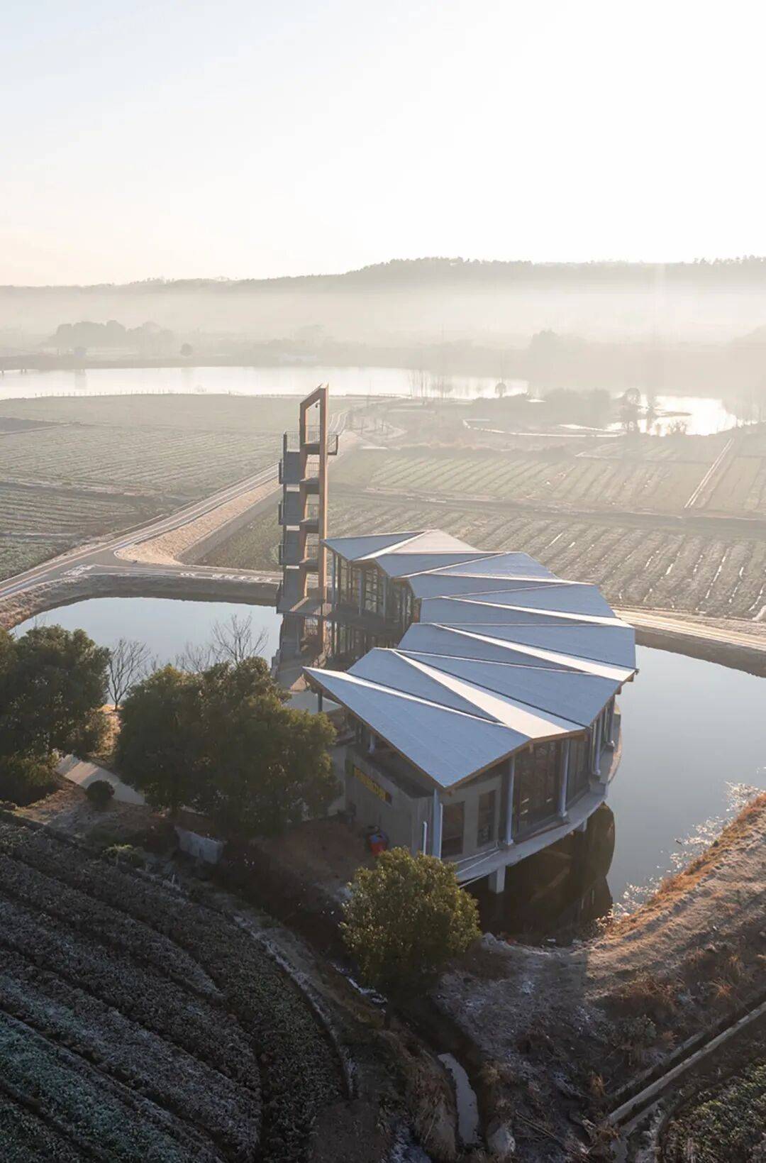 © 赵奕龙 稻田与水塘之间,一段不规则的用地被田埂与农路切割,一侧探入水面。项目同时承担稻作文化展示、农产品展销与游客停留的公共功能,并需要一处能够抬升视线的观景点。紧凑的尺度促成“塔与体的共生”:体验馆沿水岸展开,塔楼嵌入其端部,形成一组可被行走与观看的乡野装置。