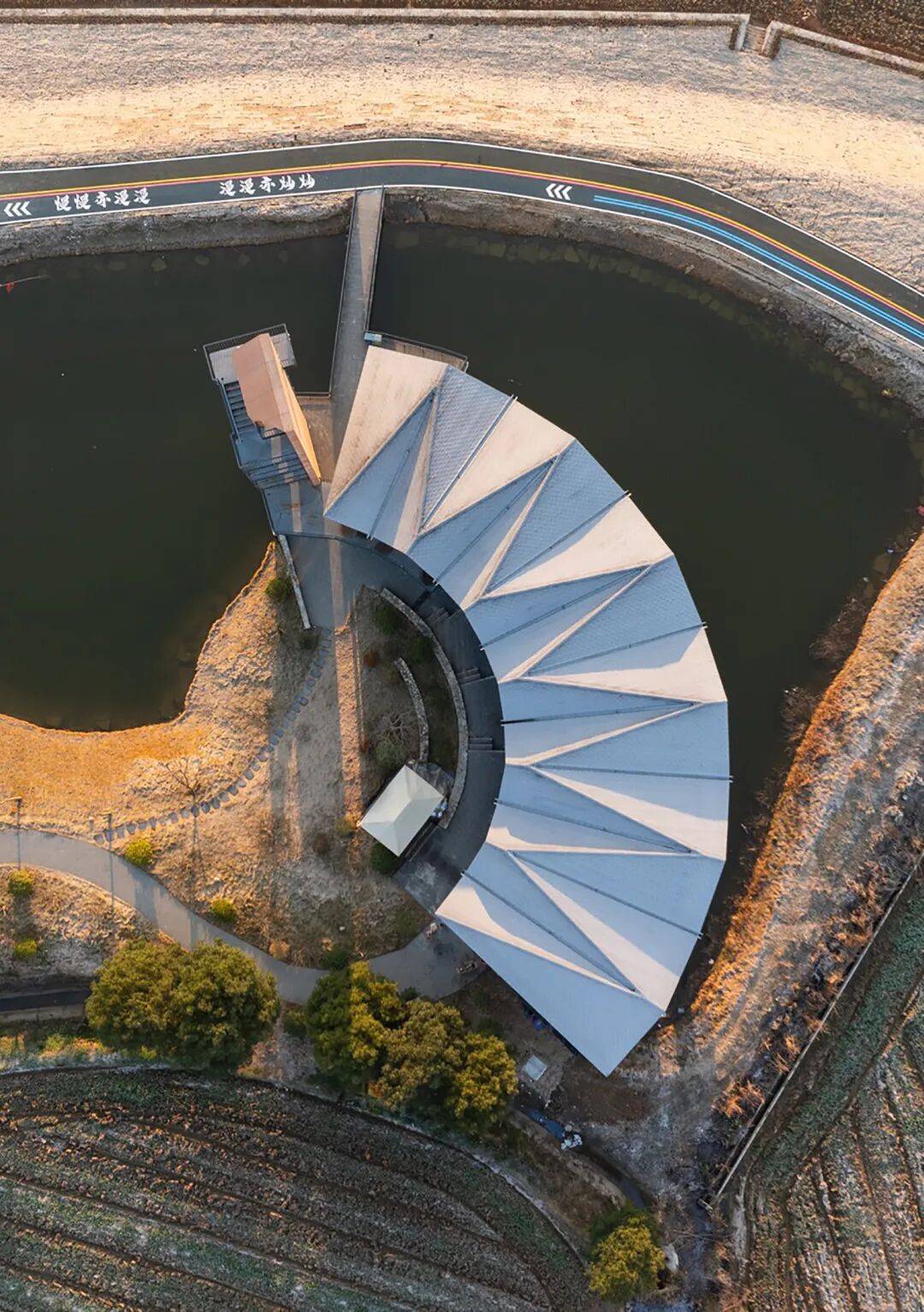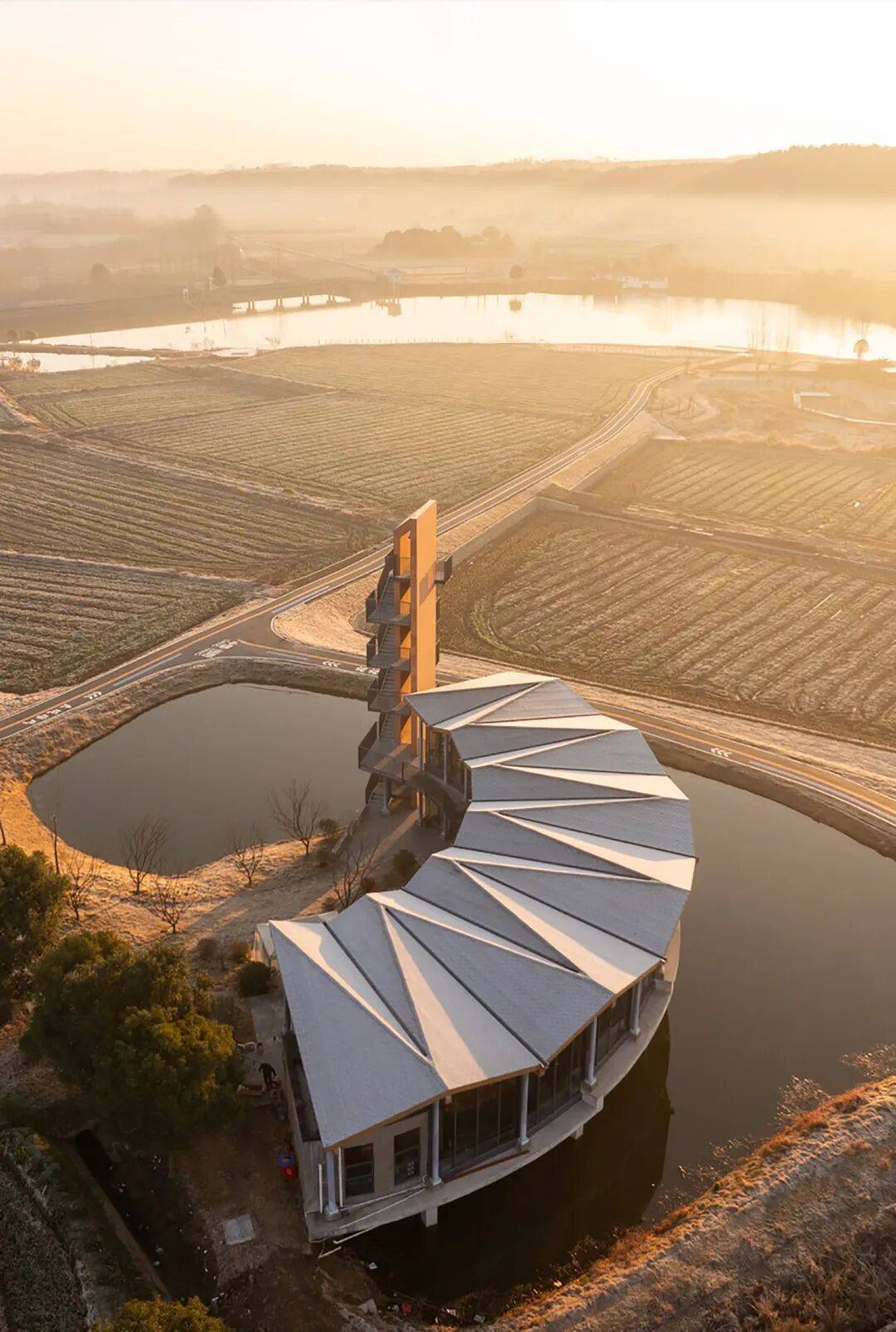 ▲场地俯拍 © 赵奕龙 ▲屋顶平面 © 辑禾设计工作室 平面以向心式弧形布局组织:建筑沿水面展开成一段收拢的弧线,形成面向水塘的内向界面。连续的展陈与展销界面串联动线,将“稻作文化”与“农产品展销/体验”嵌入同一条可漫游的空间带。不同房间在弧线牵引下依次展开,视线在临水界面与内向开敞空间之间切换,并在行走尽端自然导向竖向的观景塔。