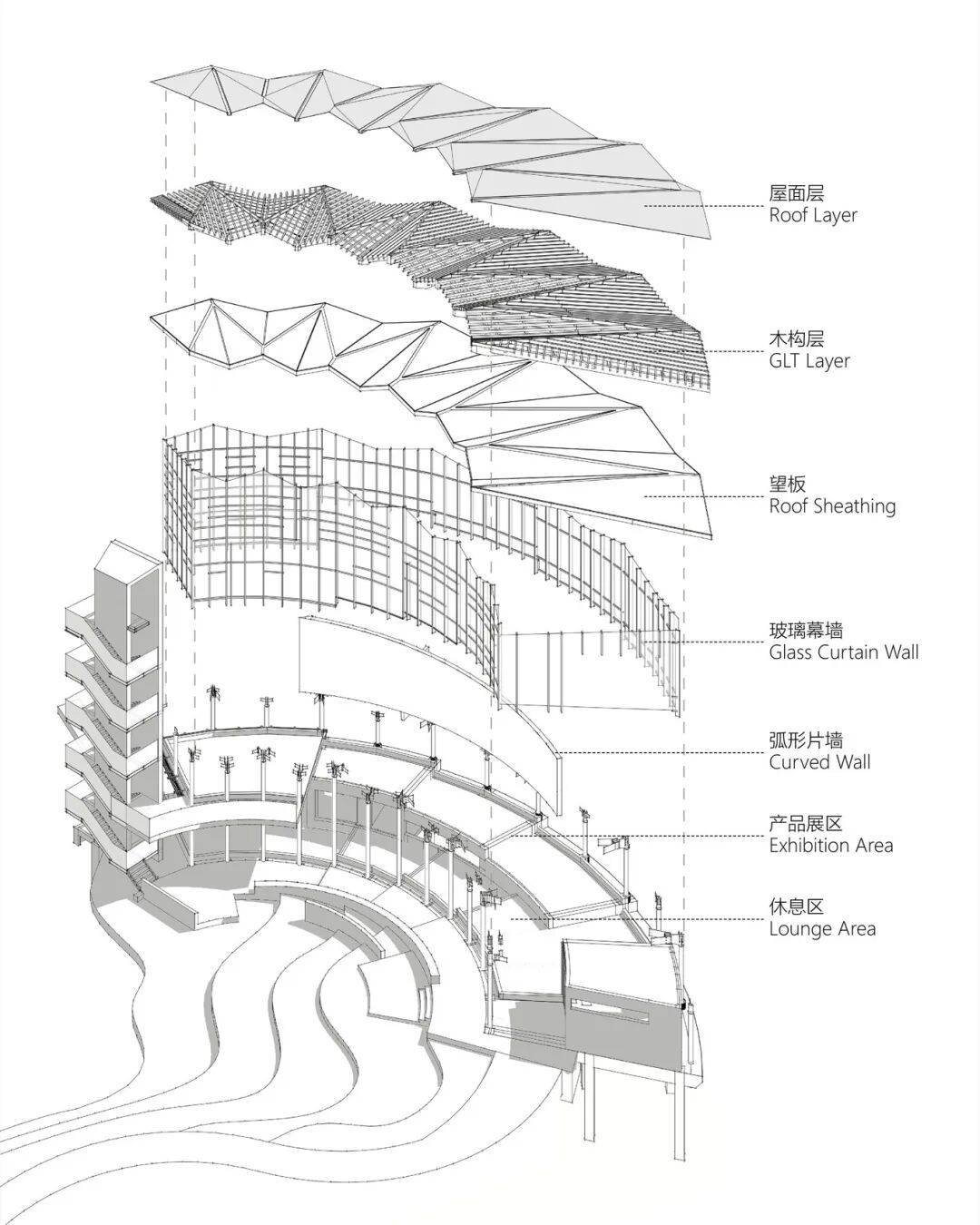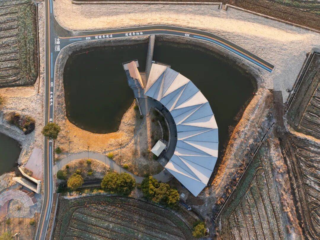 ▲项目鸟瞰 © 赵奕龙 屋顶以参数化折线生成起伏节奏,像被抬起的稻浪等高线。折线按单元化节奏逐段展开并连续拼接,将展厅、服务与停留空间统一在同一片“覆盖”之下;高低变化在体量上削弱乡村公共建筑常见的厚重感,使建筑更像一片轻覆在田水之间的构架。从结构轴测与细部可见,木屋面与钢柱体系共同形成清晰而轻盈的构造边界。
