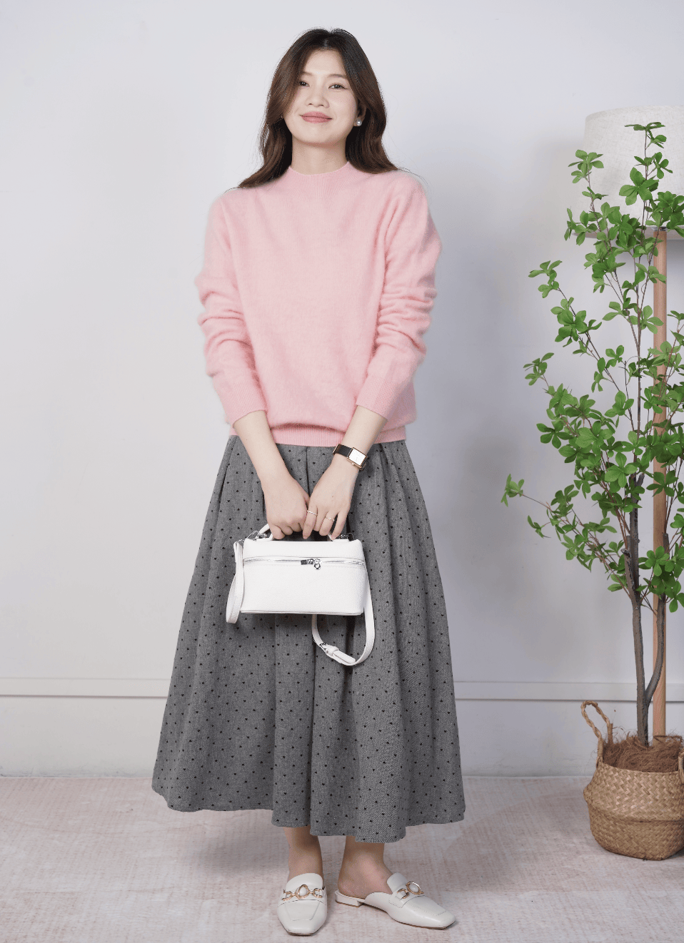 香梨一般的鹅黄,是友好的颜色,也很适合来年春天。它穿上后给人的感觉也像梨一样,一开始淡淡的,却越品越香。