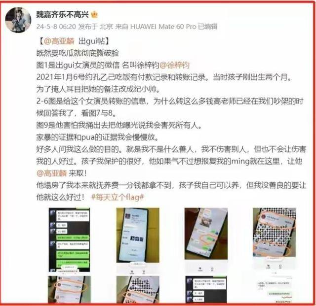 据魏嘉所说,高亚麟在婚姻存续期间出轨,还对她实施家暴,孕期多次掐脖子、扇耳光,甚至导致她先兆流产。 魏嘉晒出了亲密照、聊天记录和医院诊断证明,还说高亚麟在孩子出生仅两个月时,就给其他女性转28888元、38888元等大额款项。 面对这些指控,高亚麟选择沉默不语,既不承认也不否认,让网友更加愤怒。