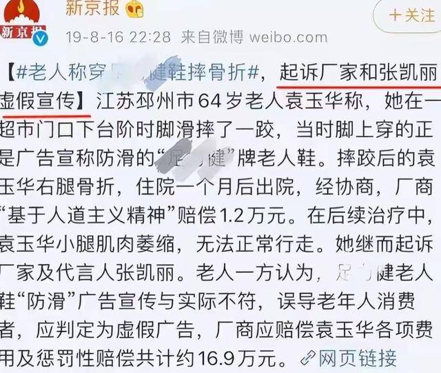 可现实却是,不少老人穿着这双鞋出门时意外滑倒,有人甚至摔成骨折。 官方抽检后发现,这款鞋子的防滑系数远低于国家规定标准,还容易开胶、磨损,就是不合格产品。 品牌方被罚款召回,可作为核心代言人的张凯丽,从头到尾没给受伤的老人道过一句歉,也没给出任何说法。