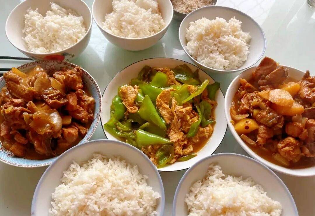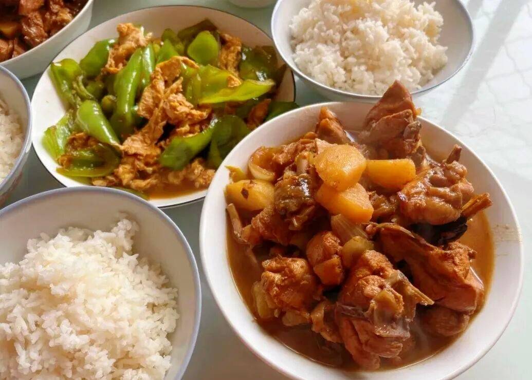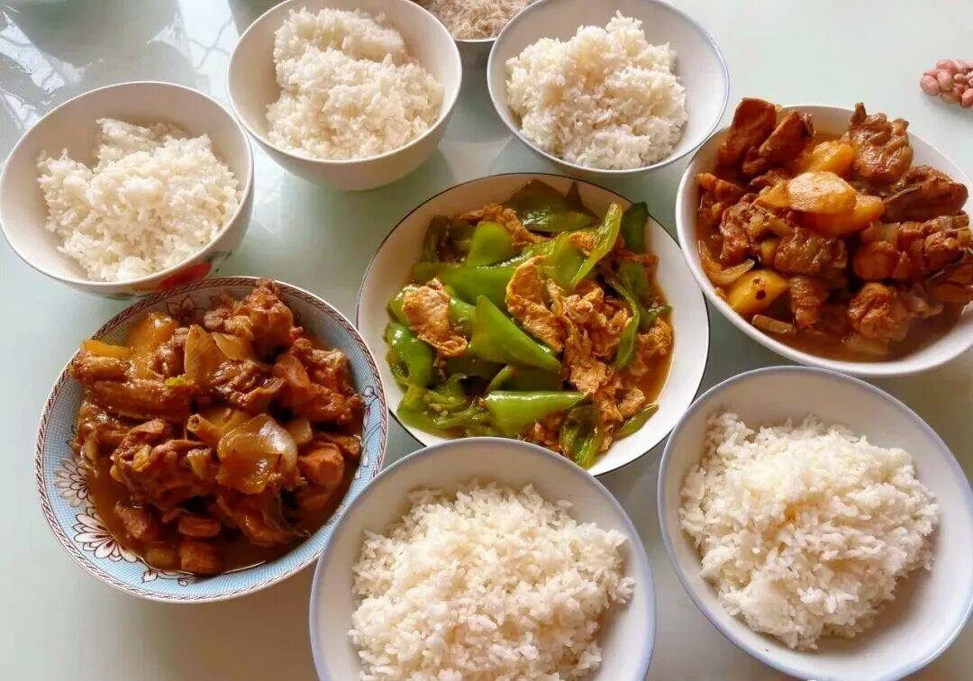 除了炒鸡,婆婆还炒了个青椒炒肉片,青椒是自家院子里种的,鲜辣脆爽,肉片滑嫩入味,配米饭简直绝了。就这俩菜,配上大白米饭,我们一家五口吃得满头大汗,连吃三碗都不够。