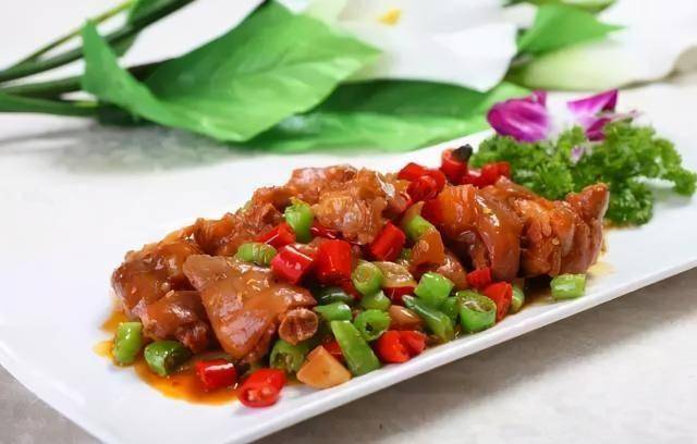 原料:黄河大黑鲤(也叫生鱼)净鱼片500克,雨花石1千克,杏鲍菇、千页豆腐各100克,木耳、豆芽、香菜各50克、鸡蛋清1个。 调料:A料(盐、鸡粉各5克,胡椒粉、鲜奶各10克),干辣椒段20克,青花椒8克,白芝麻10克,麻辣汤汁1250克,色拉油30克。 制作: 1.大黑鲤的鱼片(不宜太薄)用A料腌制入味;雨花石在烤箱中烤热(温度为200℃);千页豆腐切片;杏鲍菇切片;豆芽、木耳氽水。 2.起锅将油烧热,放入干辣椒、青花椒煸香,制成麻辣油盛到料汁碗中,上面撒上白芝麻。 3.将烤好雨花石取出,放入铜锅内,把千页豆腐、杏鲍菇、豆芽、木耳垫底,上面摆好鱼片,然后并迅速倒入烧好的麻辣汤汁,再倒入麻辣油,撒上香菜即成。 麻辣汤汁:将郫县豆瓣700克,葱、姜、蒜各50克,干辣椒节300克,麻椒100克与熟菜籽油1千克和葱油500克炒香,加二汤5千克熬制5分钟,过滤即可。 香辣猪蹄