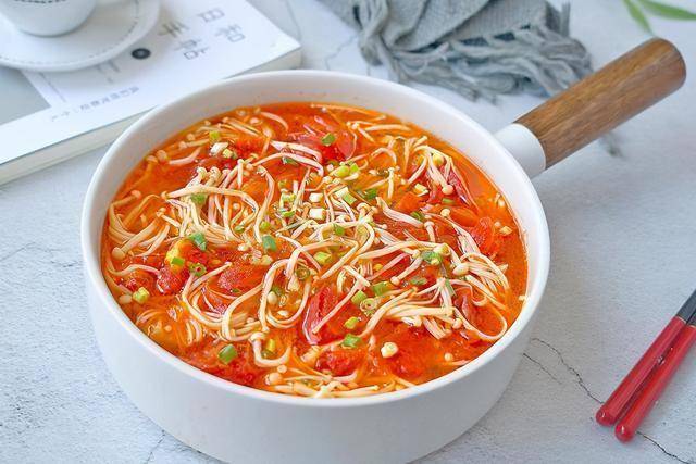 材料:金针菇180克、西红柿2个、盐1茶匙、鸡精少许、葱2棵、醋数滴 1、将西红柿切成滚刀块备用,把金针菇切成很小的段, 2、烧开水,放入金针菇焯水后捞出过凉水, 3、热锅热油,放入西红柿翻炒1分钟,加入盐、醋、鸡精,继续翻炒1分钟, 4、再加入半碗水煮开,倒入金针菇煮开,撒入葱花即可关火 蚝油茄子