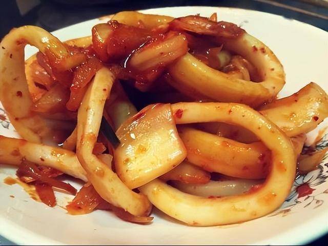 食材:辣白菜200克、鱿鱼圈250克、大蒜半棵、青椒1根、洋葱半棵、生姜适量、料酒2勺、生抽2勺、韩国辣椒酱1勺、盐适量