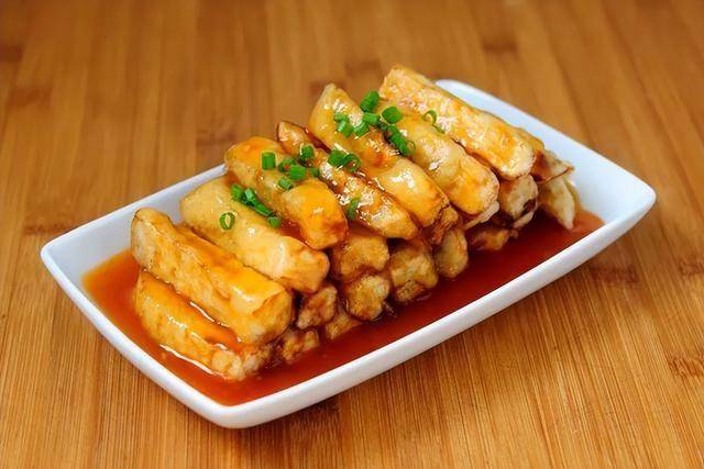 3、 茄子放入油锅中小火炸至定型后捞出,复炸一遍上色,逼出茄子过多吸入的油。复炸后的茄子,外壳已经是脆脆的了,装盘待浇汁。