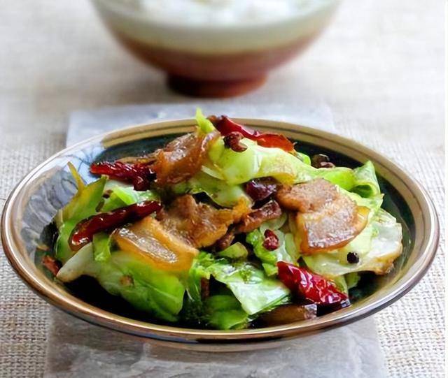 4、锅中留底油,将辣椒和大蒜,花椒放入,小火炸出香味后放入包菜,翻炒至半熟后,放入五花肉翻炒,烹入料酒和蚝油翻炒均匀即可出锅。