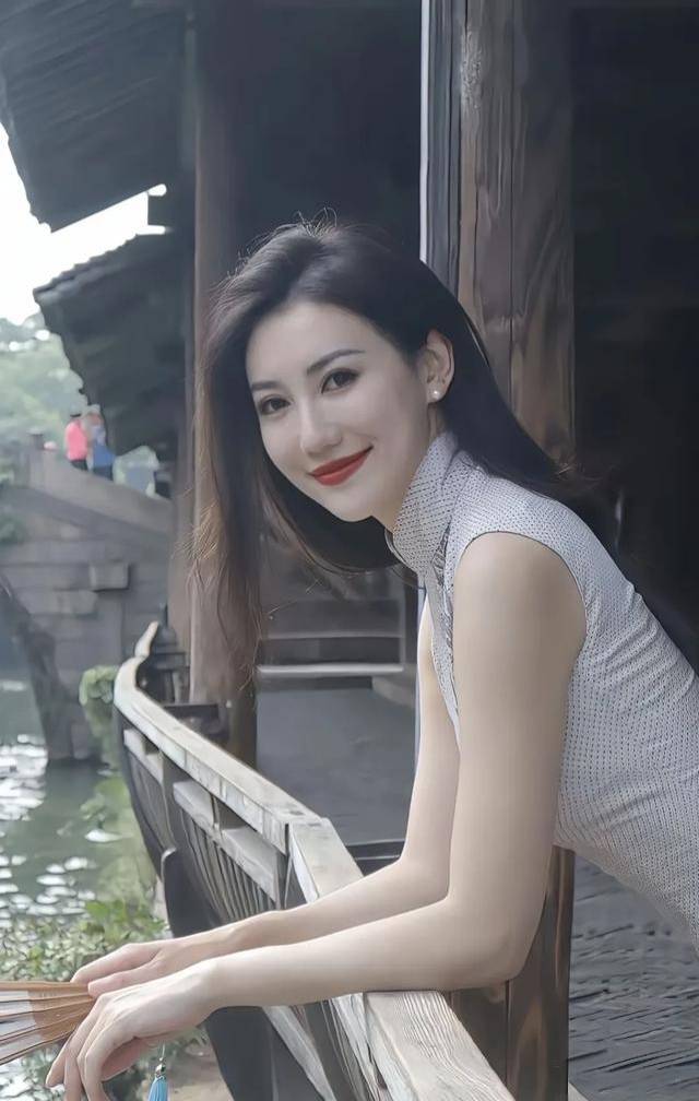 就像图片2中那位倚靠栏杆的女子,面带微笑,手中执扇,身后是小桥流水、旧木建筑。