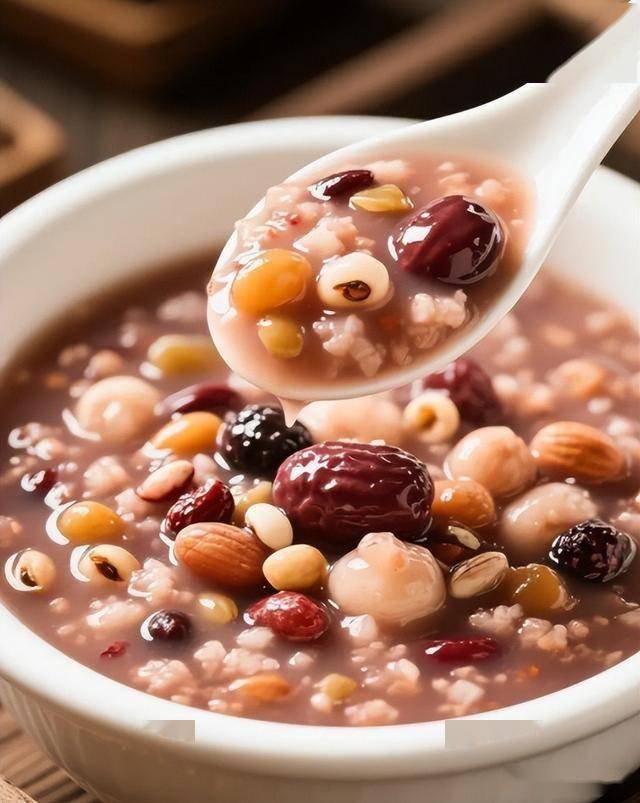 所需食材:糯米50克、黑米30克、红豆20克、花生20克、红枣10颗、桂圆10颗、莲子15克、薏仁15克、冰糖适量。