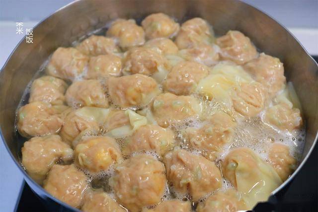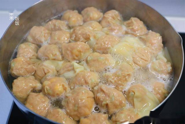 6,水开下入馄饨,大火煮开后盖上锅盖,小火煮3分钟,馄饨全部漂起来,肉馅膨胀变大就熟了。