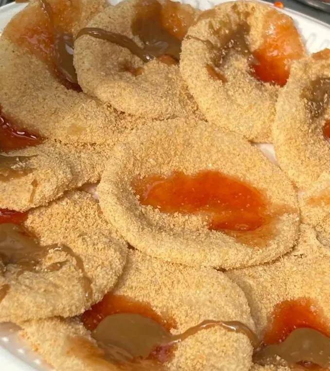 本应特征:糯米蒸熟后捶打成型,可煎可炸,蘸黄豆粉或红糖