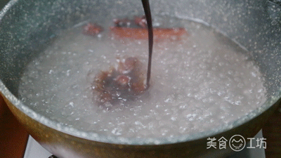 4. 清水倒于锅中,加八角,桂皮煮开,倒入调好的酱汁,再次煮开后,放入花椒后倒入盆中放凉备用。