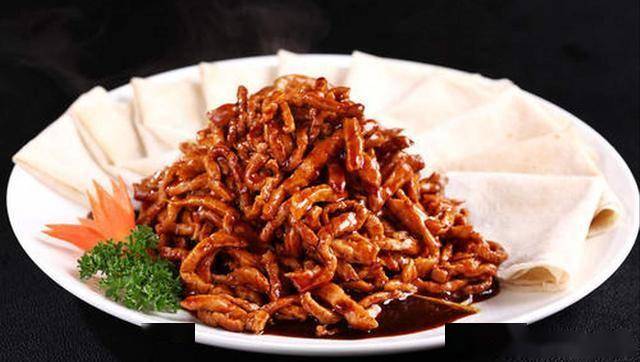 猪里脊250克(切丝),甜面酱3汤匙,豆腐皮2张,黄瓜、大葱白适量(切丝),蛋清1个,淀粉、料酒、白糖、生抽、老抽少许。