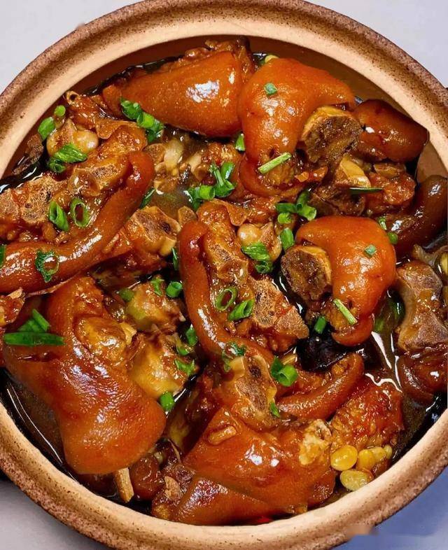 4. 加适量清水,大火烧开后转小火慢炖 1 - 1.5 小时,至猪蹄软烂,加盐和鸡精调味即可。
