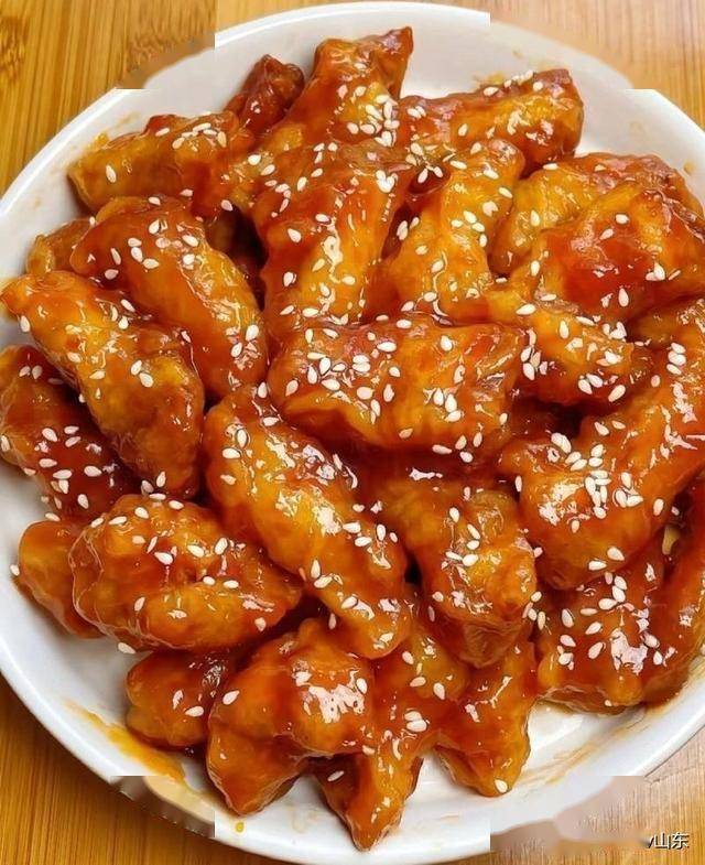 是否出现在图片中? 不确定(图片4显示酱汁裹料+白芝麻,符合糖醋里脊特征)