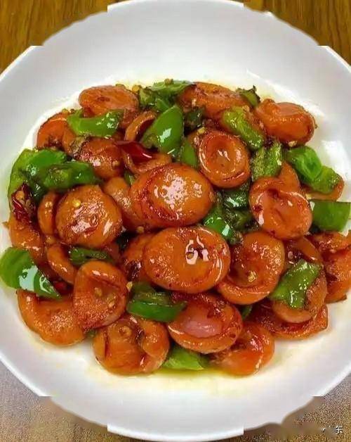 4. 调味出锅:将炒好的香肠倒回锅中,与青椒一同翻炒均匀。沿着锅边淋入一勺生抽,激发出酱香味,再加一小撮白糖提鲜。快速翻炒30秒,让所有食材均匀裹上味道,即可出锅装盘!