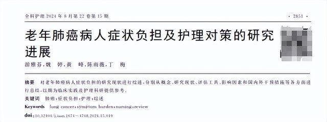 [1]游雅芬,魏婷,黄峰,等.老年肺癌病人症状负担及护理对策的研究进展[J].全科护理,2024