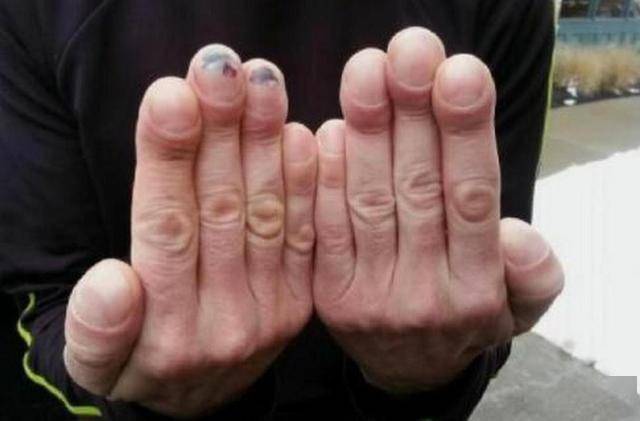 典型案例:图片2中展示的双手呈现典型杵状指特征,指甲末端钝角弯曲